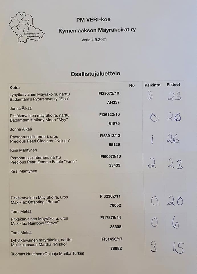 Kymenlaakson Mäyräkoirat ry järjesti 5.9.2021 terrierien ja mäyräkoirien piirinmestaruusvesiriistakokeen Kouvolassa Verlassa. Ylituomarina kokeessa oli Markku Valtonen ja vastaavana koetoimitsijana Hanna Nyström. Piirinmestaruudesta kisasi neljä koiraa, lisäksi kokeessa oli 3 muuta koiraa. Sää oli aurinkoinen mutta tuulinen ja kylmä.