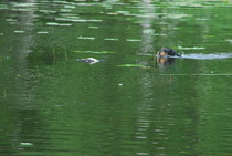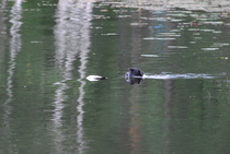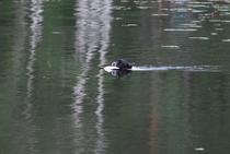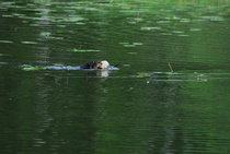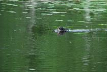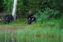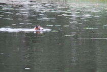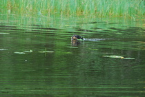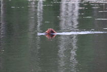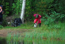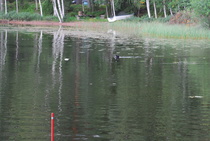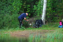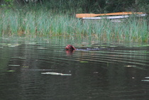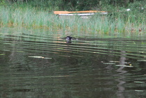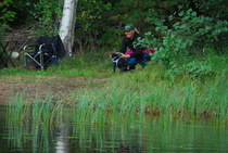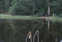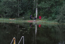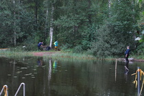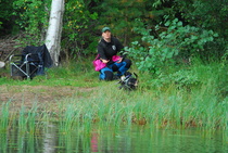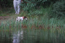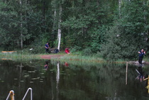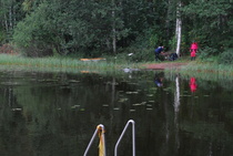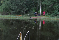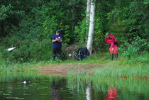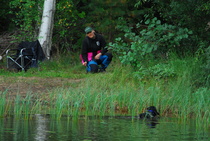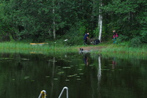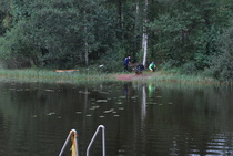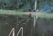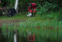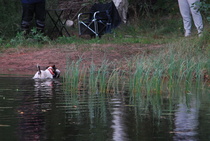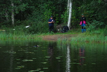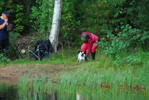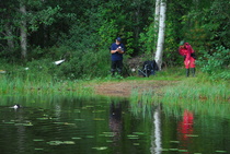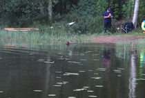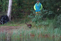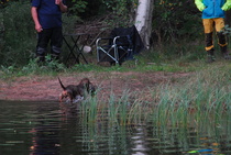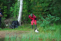 Kun kaikki koirat olivat suorittaneet jälkiosuuden, siirryimme vesiosuuksiin. Ensin kaikki koirakot kävivät vuorotellen rannassa tuomarin kanssa tutustumassa uitavaan hakualueeseen. Ensimmäisenä vesiosuutena oli haku: koiran on mentävä uimaan ohjaajan käskystä ja uitava kattavasti tuomarin ennalta määrittelemä vesialue.