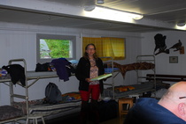 Seuraavaksi kuulimme Suomen Mäyräkoiraliiton terveiset vesiriista-toimikunnan vetäjältä Maarit Nybonnilta. Maarit muun muassa kiitti Kymenlaakson Mäyräkoiria siitä, että olemme ottaneet vastuullemme järjestää nämä ensimmäiset Suomen mestaruuskokeet. Tämän jälkeen annoimme pienet muistamiset niin tuomarille kuin koetoimikunnallekin ja pääsimme jännittämään tuloksia.