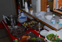 Koirien suoritusten jälkeen nautimme maistuvan päivällisen. Tarjolla oli Hirvilammen luomu paahtopaistia, Ahvenkosken kalasavustamo savulohta, keitettyjä perunoita, kasvispaistosta sekä vihersalaattia. Jälkiruoaksi saimme marjarahkaa.
