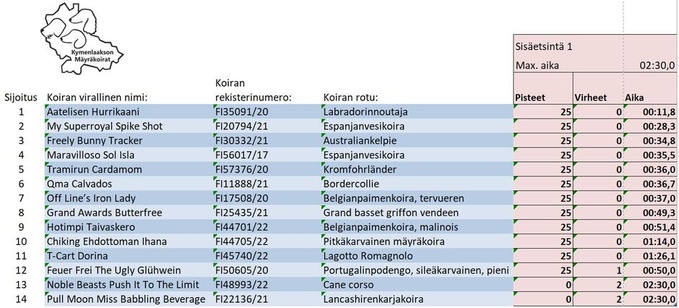 Tänään pidettiin Kymenlaakson Mäyräkoirien ensimmäinen nosework-koe. Kyseessä oli ykkösluokan sisäetsinnän koe Elimäellä, ylituomarina Lasse Myllylä. Kokeeseen osallistui 14 koiraa, joista yhdeksän sai luokkanousutuloksen. Onnea kaikille! Kokeen tulokset ja etsintäalueet näkyvät kuvissa.