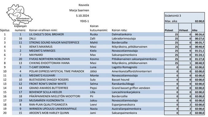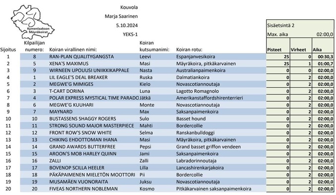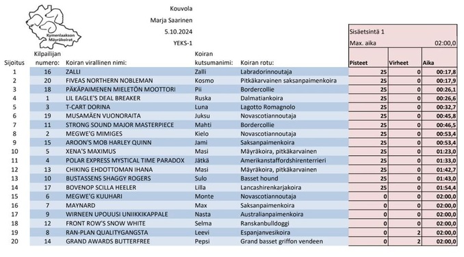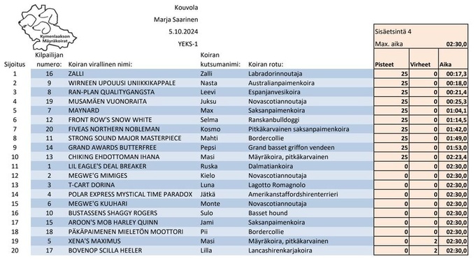 Kiitos Marjalle, osallistujille ja talkoolaisille hyvin sujuneesta koepäivästä! Suuri kiitos myös kokeen palkintosponsoreille Danpii Oy Lemmikkitarvike & Hyvinvointipalvelut ja Kiviharjun koirahoitola.